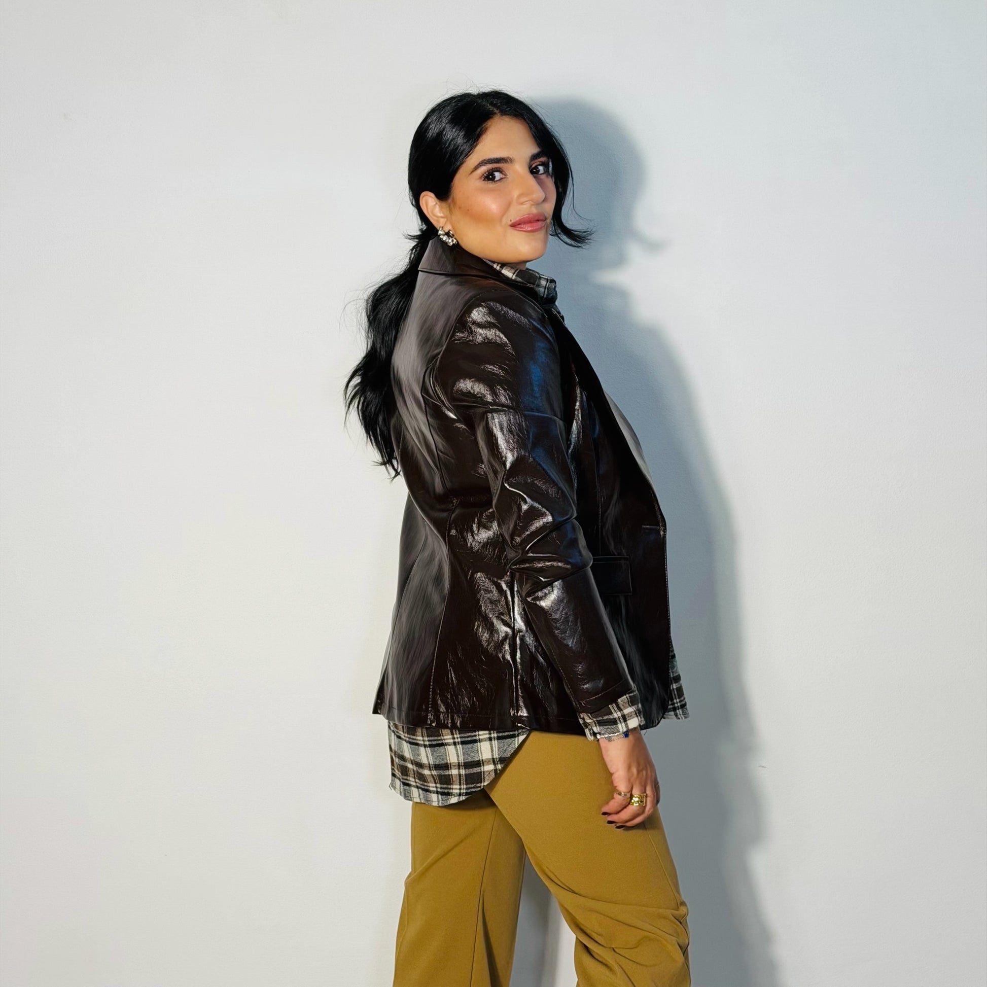 Distinguiti con il nostro blazer in vinile, il capo perfetto per chi ama osare senza rinunciare a stile e classe. La superficie lucida e strutturata dona un effetto moderno e deciso, trasformando ogni outfit in un look d’impatto. Perfetto da indossare sopra abiti, top o anche outfit casual, è il dettaglio che porta una ventata di originalità al tuo guardaroba.
