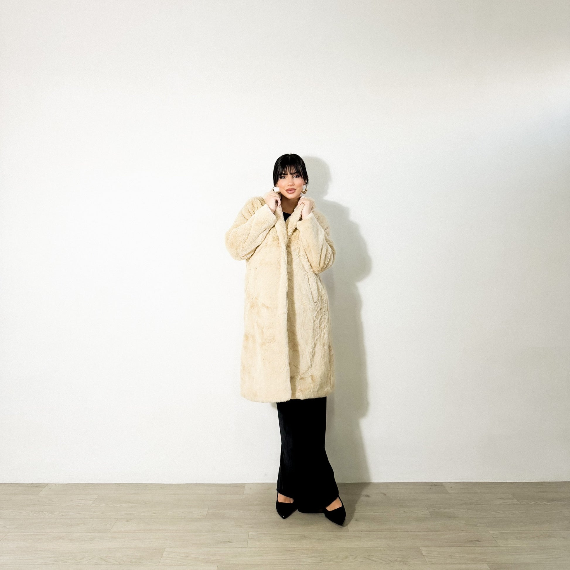 CAPPOTTO TEDDY- Avvolgente, caldo e irresistibilmente morbido: il nostro Cappotto Teddy in pelliccia rasata beige è il capo perfetto per affrontare l’inverno con stile. Il design minimal ed elegante lo rende facile da abbinare a look casual o più ricercati, mentre la texture soffice dona comfort e un tocco di lusso.