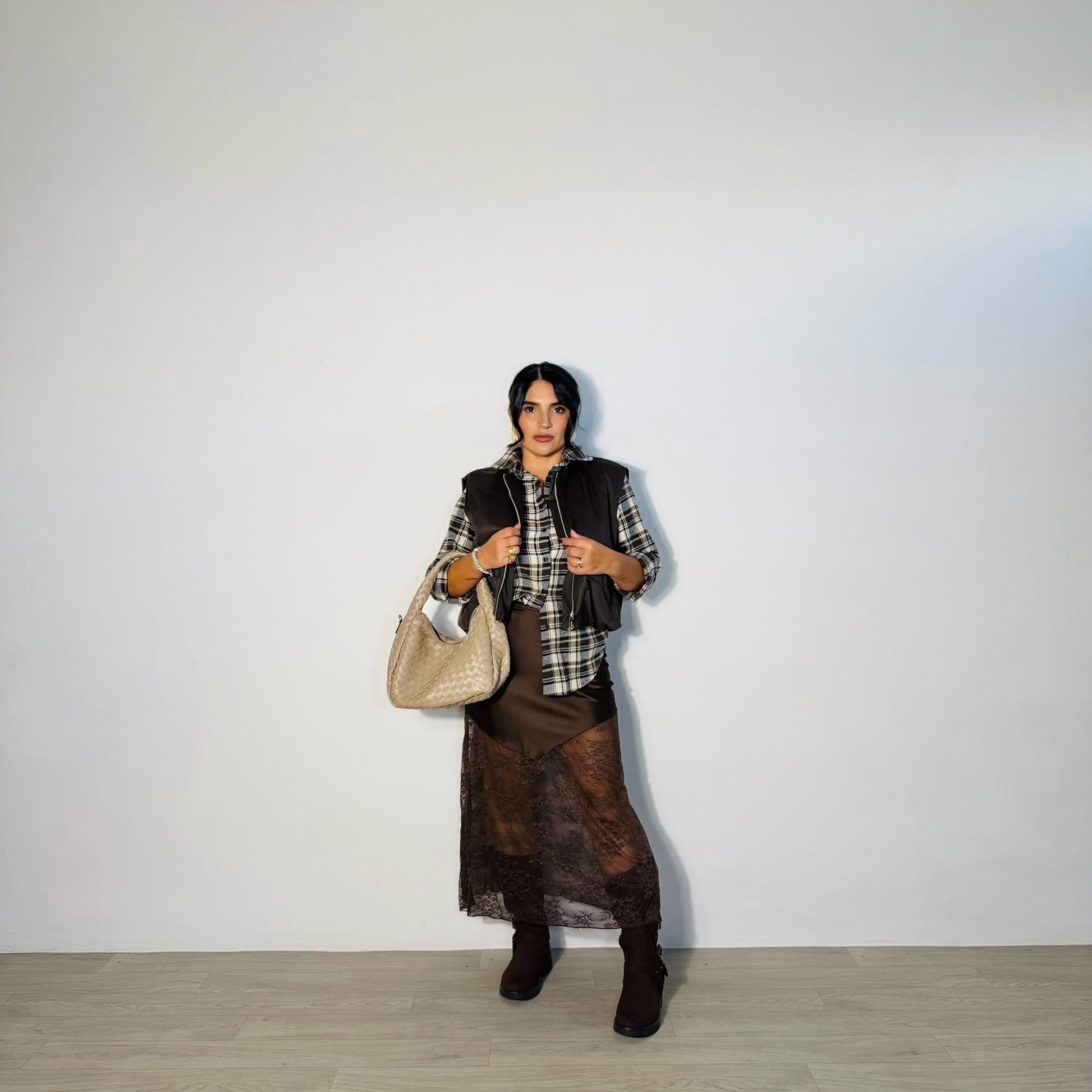GONNA SATIN LACE MARRONE – Eleganza con un tocco sensuale.