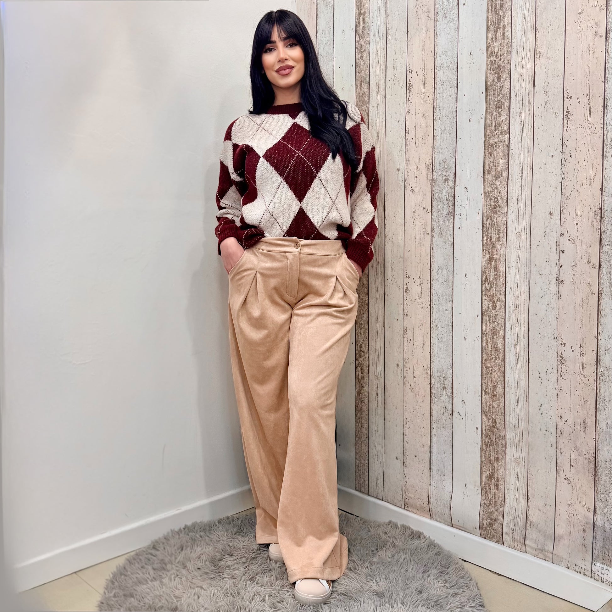 Scopri il PANTALONE SUEDE CAMEL, il tuo nuovo compagno di stile! Realizzato in morbido suede, questo pantalone a palazzo con pences e tasche è perfetto per un look elegante e senza sforzo. La chiusura con zip e bottone e l'elastico in vita garantiscono comfort e vestibilità per taglie M-XL. Elevati in ogni occasione!