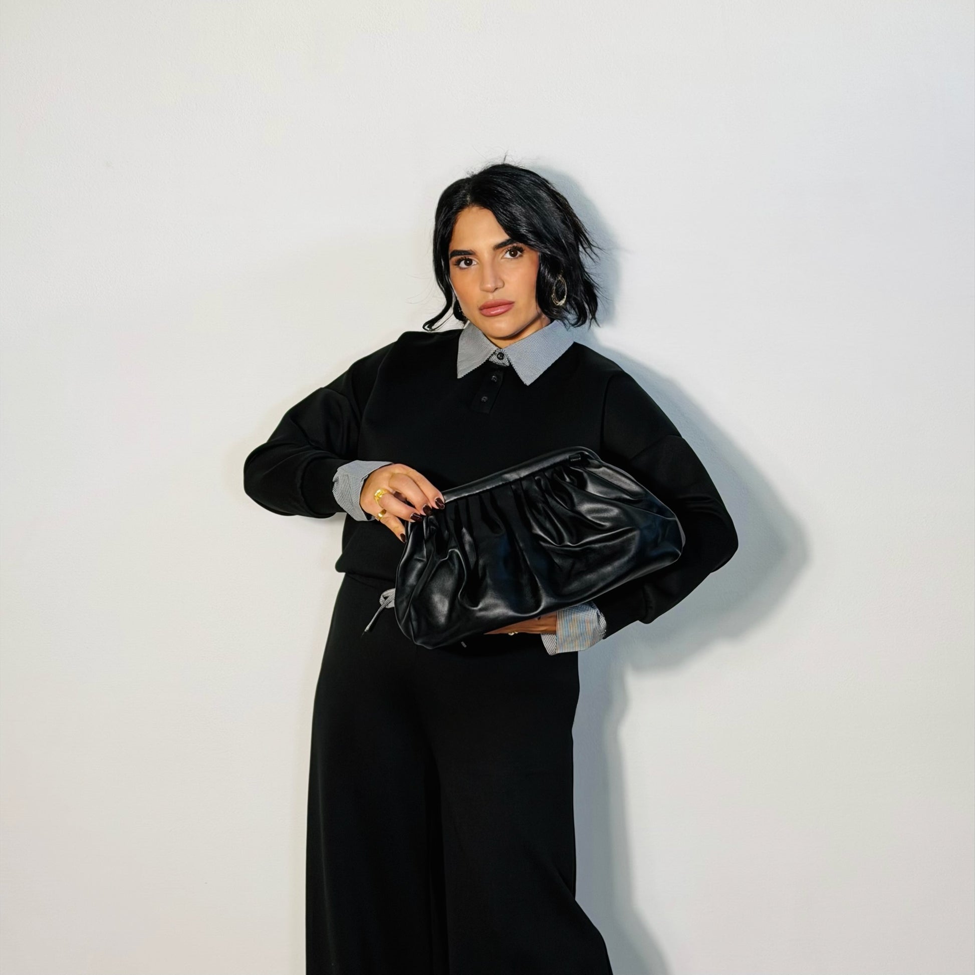 Completa ogni outfit con la nostra maxi pochette nera, l’accessorio perfetto per chi cerca stile e praticità. Un accessorio capiente, che permette di portare con sé l’essenziale senza rinunciare all’eleganza. Il design minimal e raffinato la rende ideale sia per look da giorno che per eventi serali. Dotato di traccolla lunga per utilizzarla cross body o con tracolla corta da polso.