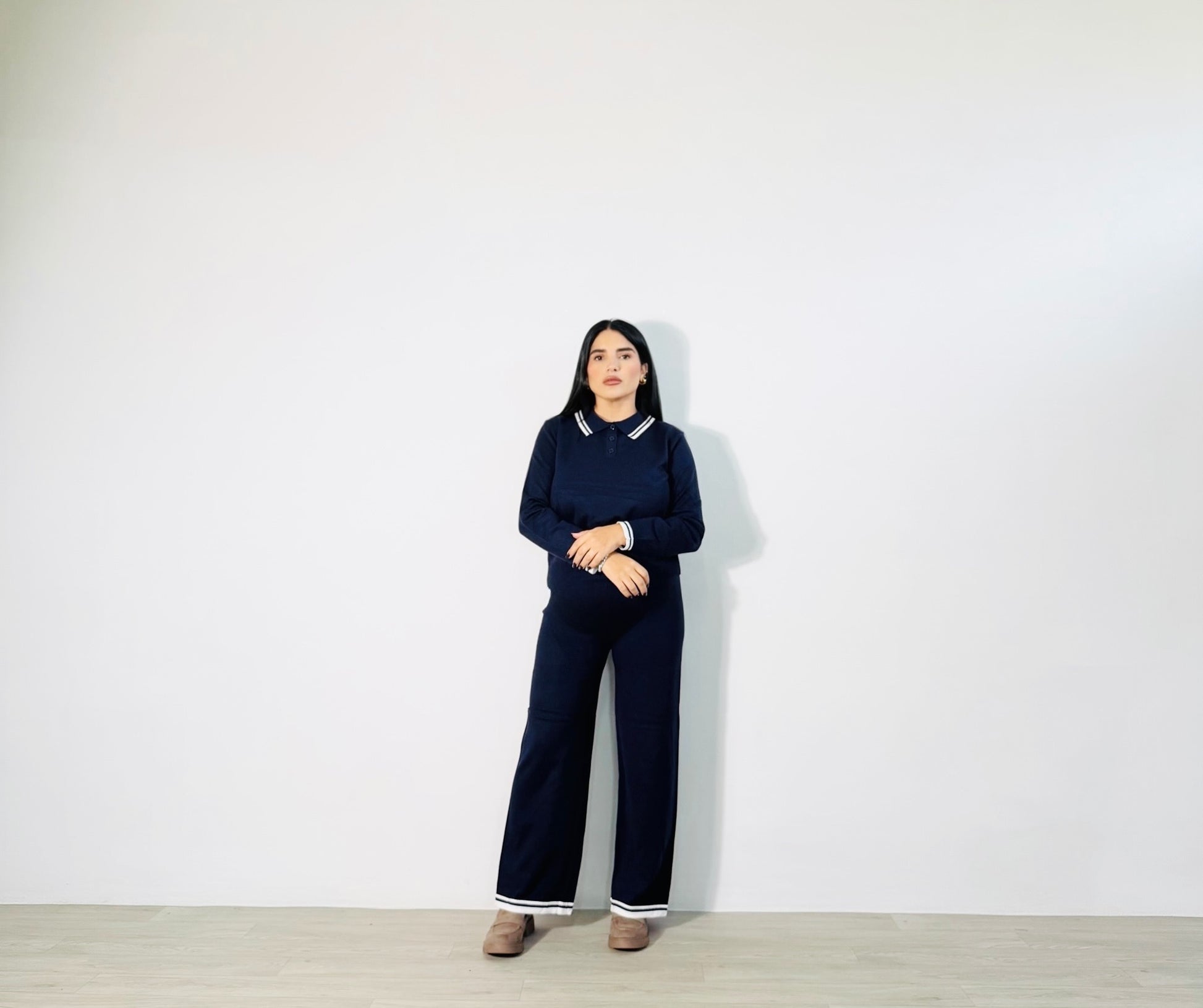 SET SAILOR – Il set che fa la differenza. Un completo due pezzi composto da polo e pantalone morbido, rifinito con dettagli a righe bianche su colletto, polsi e fondo gamba. Ispirato allo stile sailor, questo set unisce comfort e raffinatezza in un design casual chic. Perfetto da indossare con sneakers per un look quotidiano, o con sandali e accessori minimal per un outfit fresco e curato.