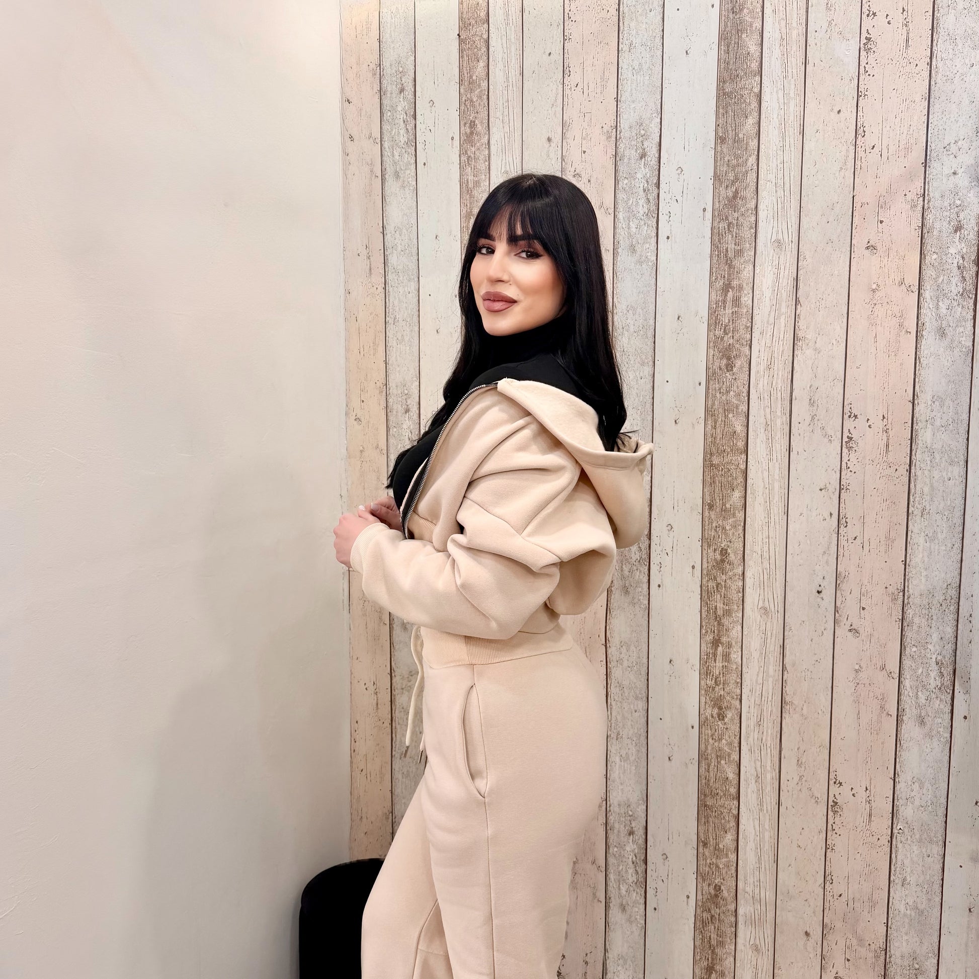 Scopri la TUTA CROP BEIGE, il perfetto connubio di stile e comfort! Composta da una felpa crop con zip e cappuccio e pantaloni ampi regolabili, questa tuta è realizzata in un morbido tessuto felpato che avvolge la pelle. Ideale per chi cerca un look dinamico e versatile!